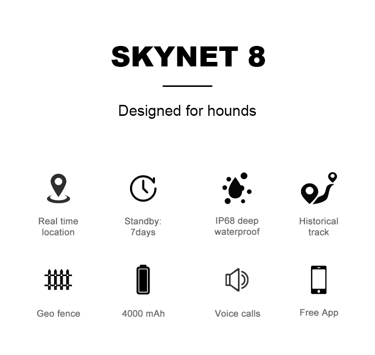 SKYNET 8 е специално създаден за ловни кучета работещи при тежки метеорологични условия (дъжд, сняг, гъста растителност със продължителна употреба)